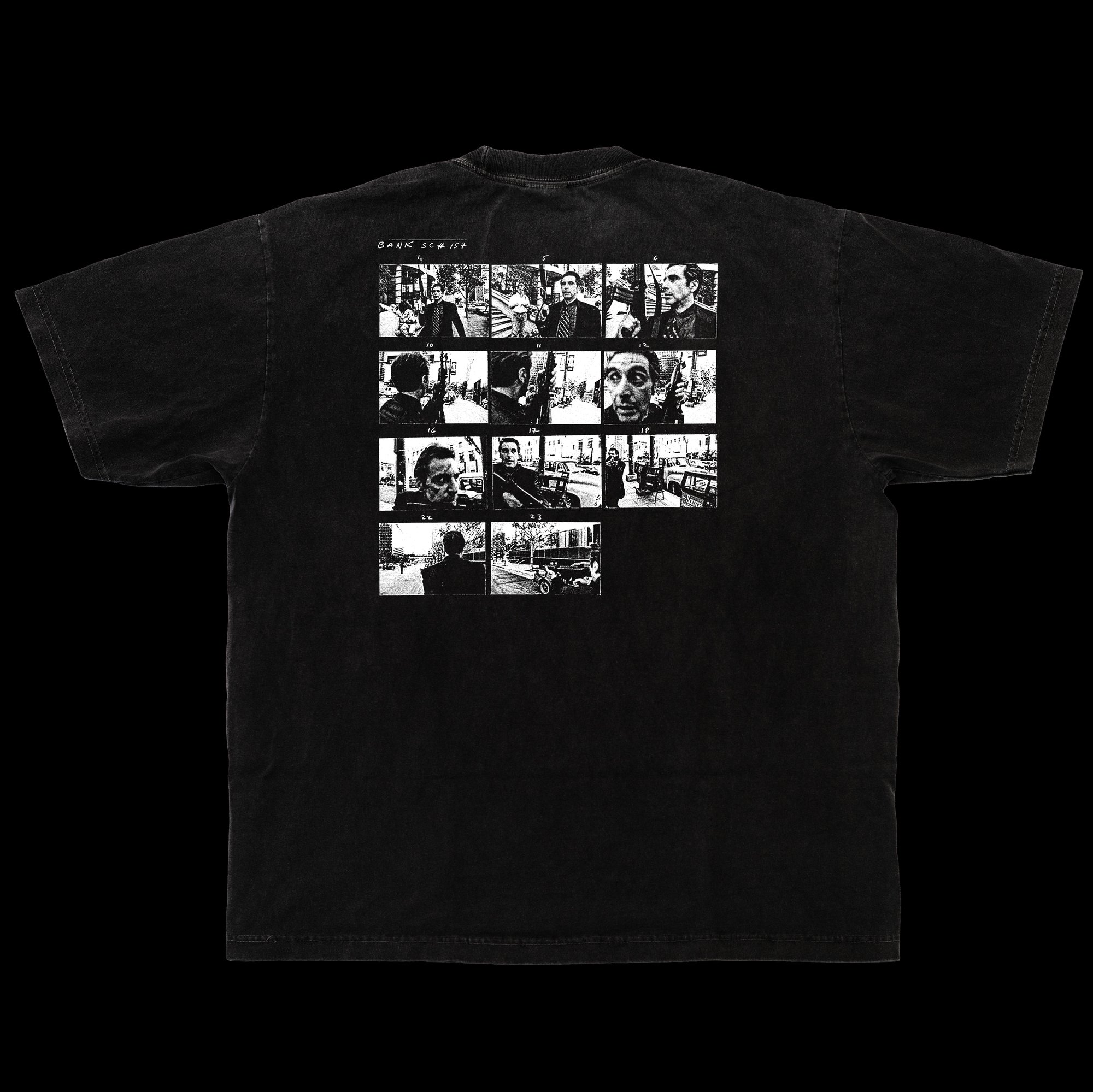 Screen printed on 6.5 oz Black Edge 1801 t-shirts. Knitted, cut, sewn, and dyed in Los Angeles, California.