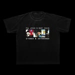 Screen printed on 6.5 oz Black Edge 1801 t-shirts. Knitted, cut, sewn, and dyed in Los Angeles, California.